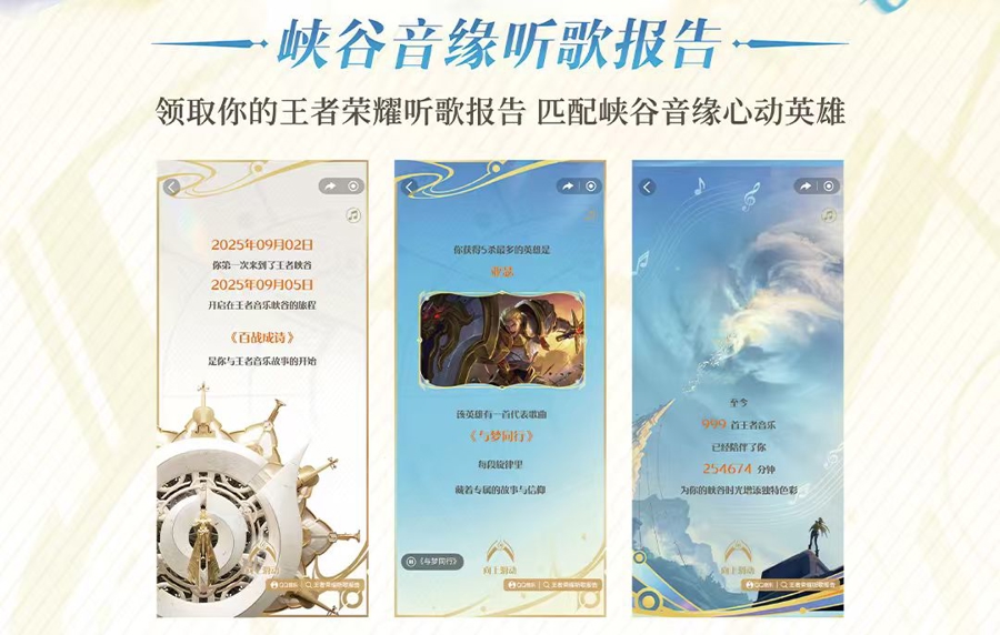 据悉,用户可在QQ音乐平台参与该活动,一键生成属于自己的王者荣耀音乐听歌报告。这份报告将细致回顾用户聆听过的王者音乐,通过数据分析,为用户解锁与其听歌品味相匹配的“心动英雄”,以独特的方式诠释“峡谷音缘”。