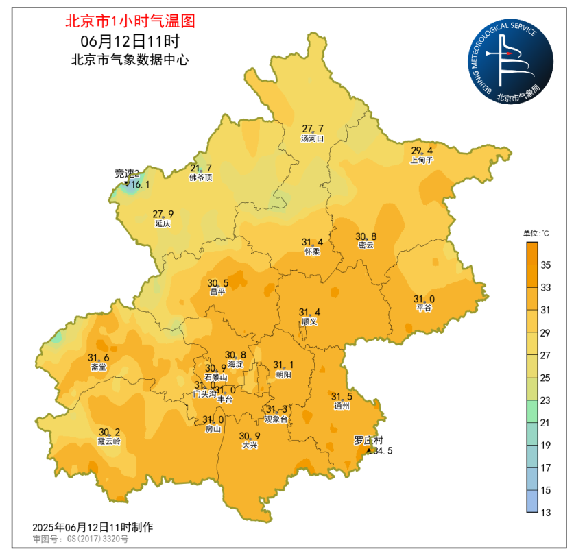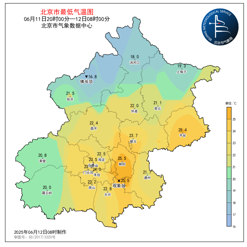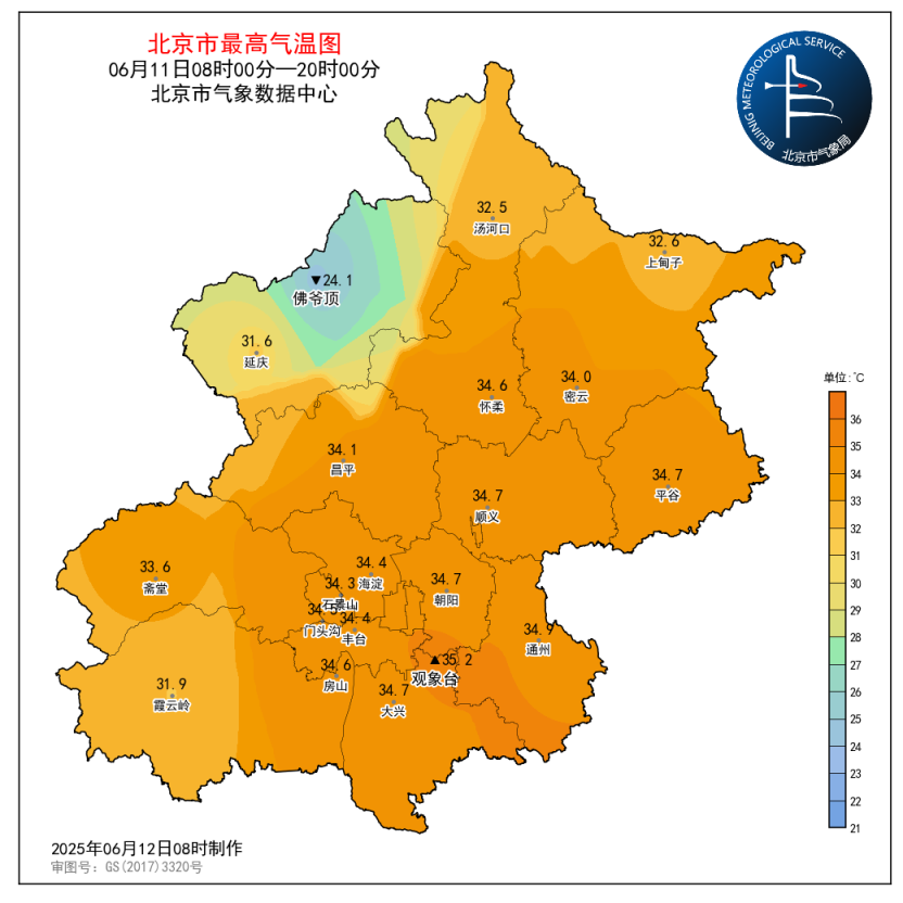 昨日(6月11日08时至6月12日08时),南郊观象台最高气温35.2℃ (15:58),最低气温25.5℃ (02:45)。